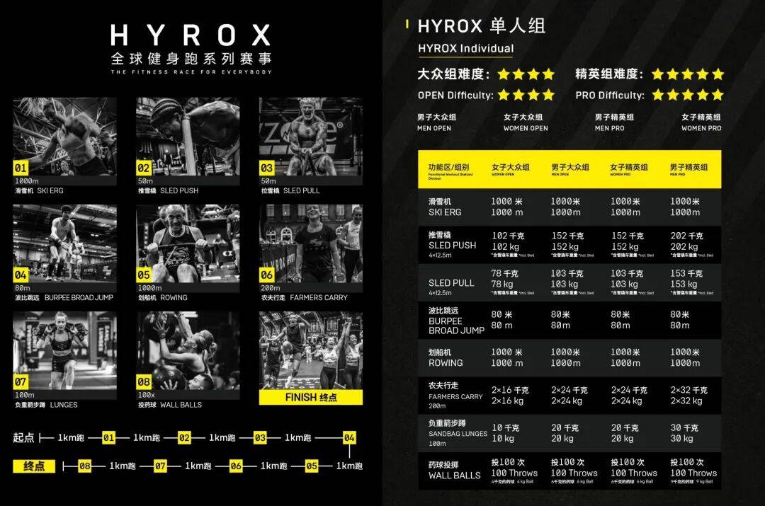 量化训练的比赛,匹配了量化目标的群体先介绍一下HYROX的比赛规则。它的比赛分8段,每段都有一个1000米跑步,外加一个专项训练,包括滑雪机、推雪橇、拉雪橇、农夫行走、投墙球等。尽管比赛强度大,但不设关门时间,也就是说,理论上你比个10个小时都没问题。